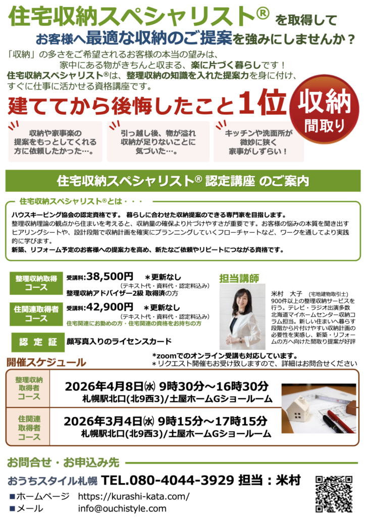 【3月4月開催】住宅収納スペシャリスト認定講座のご案内